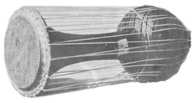 shaped sound-body with a membrane stretched tightly over one end strained by a system of