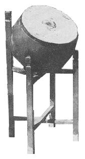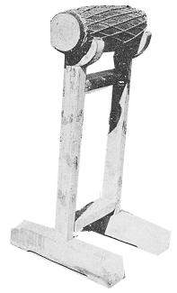 wooden resonant box is held between the musician's knees sitting on a stool. The cylinder